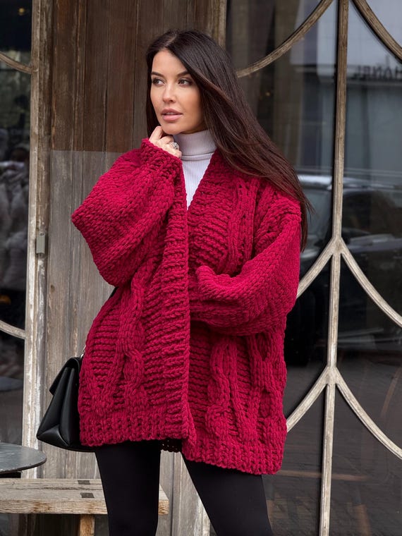 Cárdigan de crochet rojo, cárdigan de punto grueso burdeos, suéter de punto trenzado color cereza para mujer, regalo para ella, cárdigan tejido a mano Etsy España